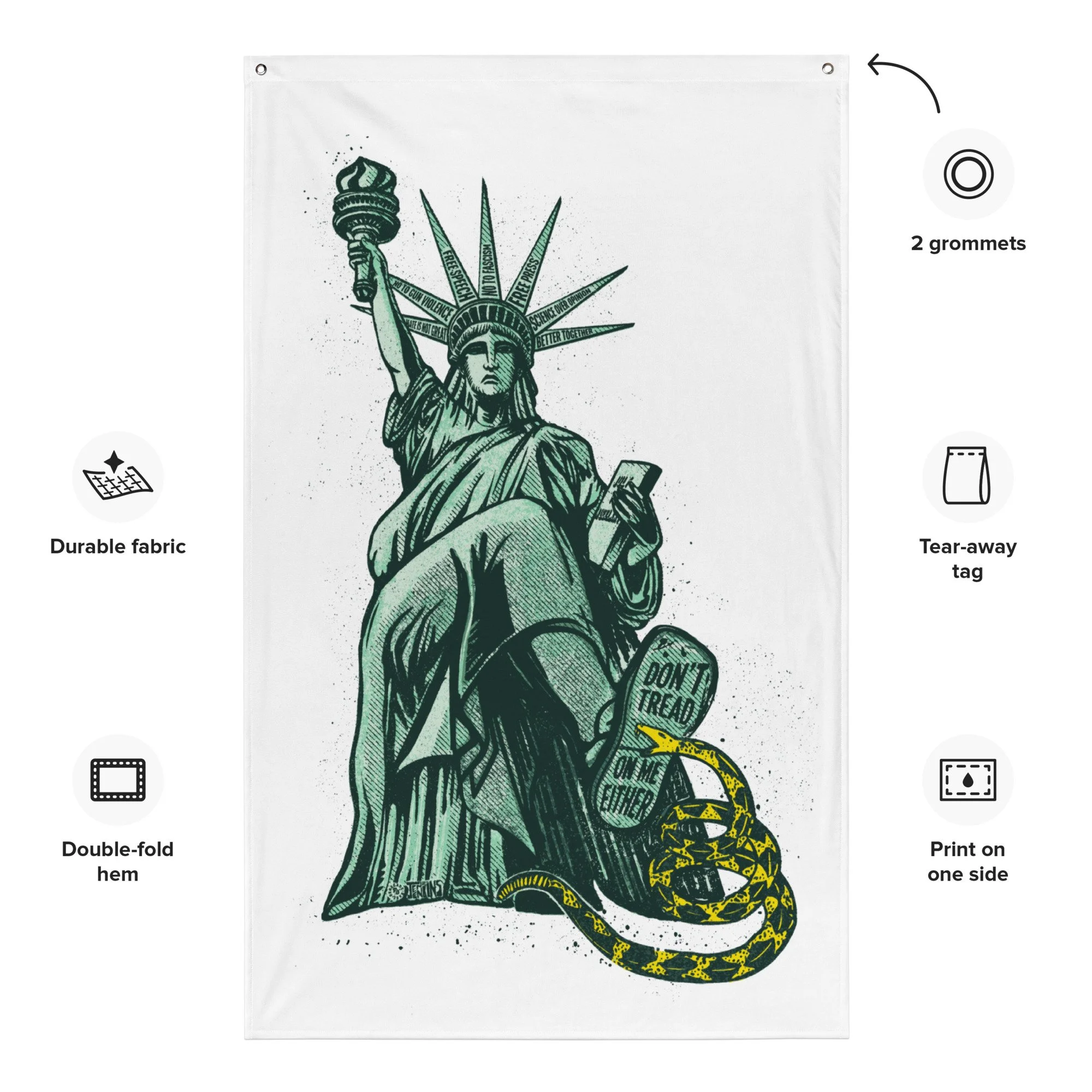 This piece flips the old “Don’t Tread on Me” symbol on its head — literally. The Statue of Liberty rises up and stomps on the Gadsden snake, reclaiming the phrase for those who believe in freedom, equality, and justice for all.