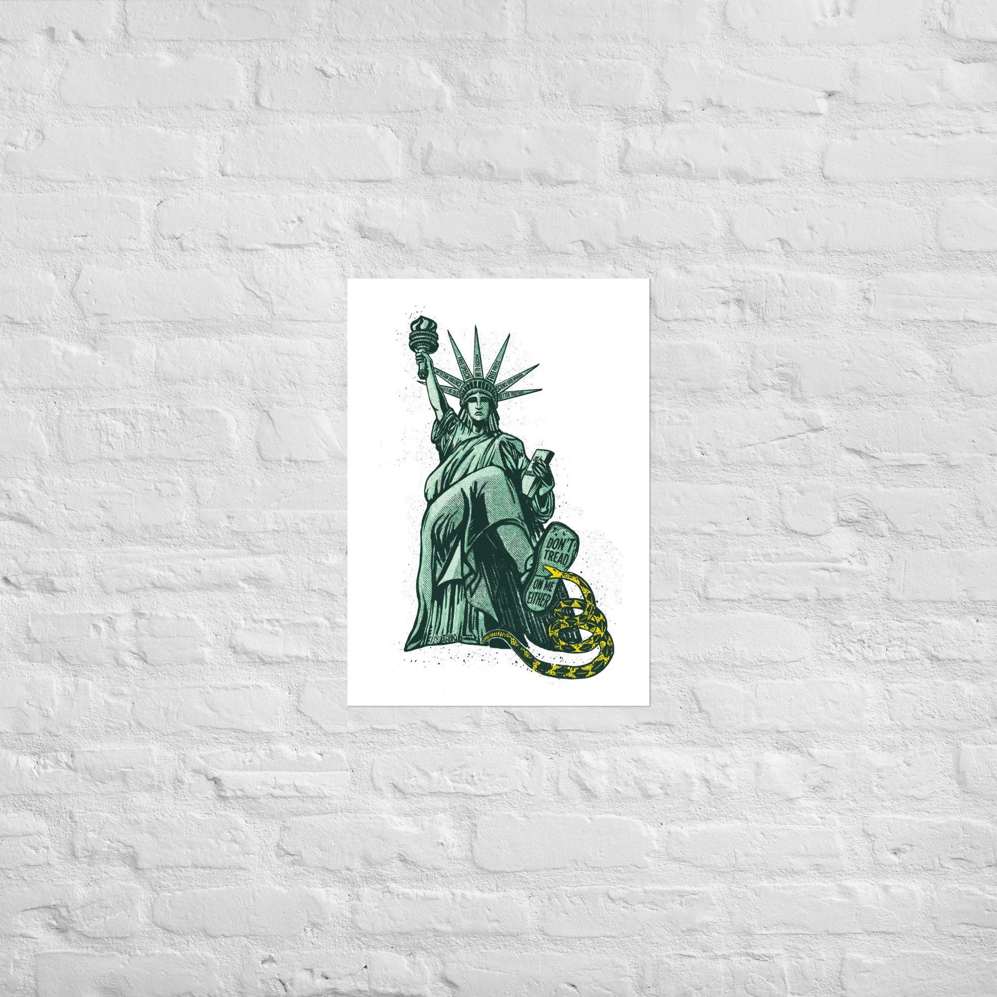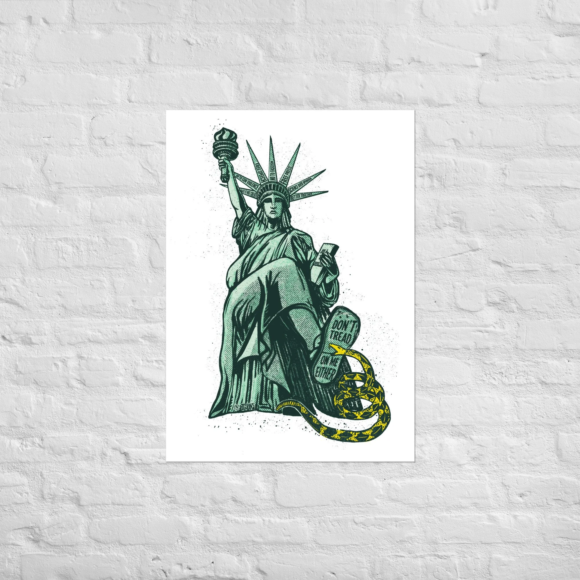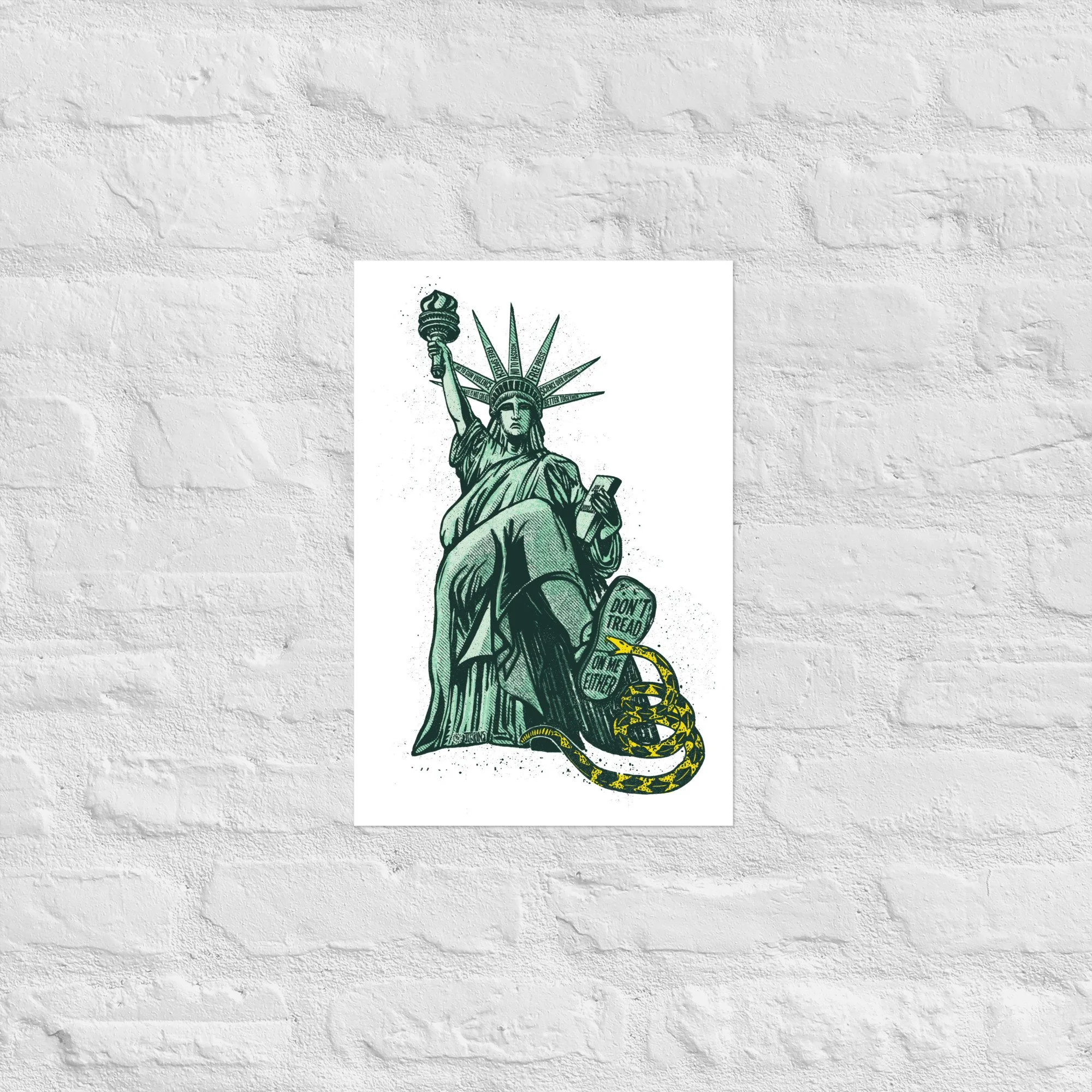 This piece flips the old “Don’t Tread on Me” symbol on its head — literally. The Statue of Liberty rises up and stomps on the Gadsden snake, reclaiming the phrase for those who believe in freedom, equality, and justice for all.