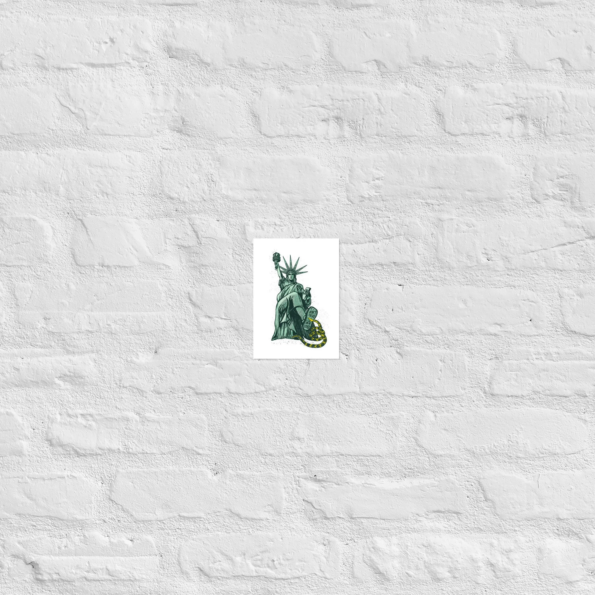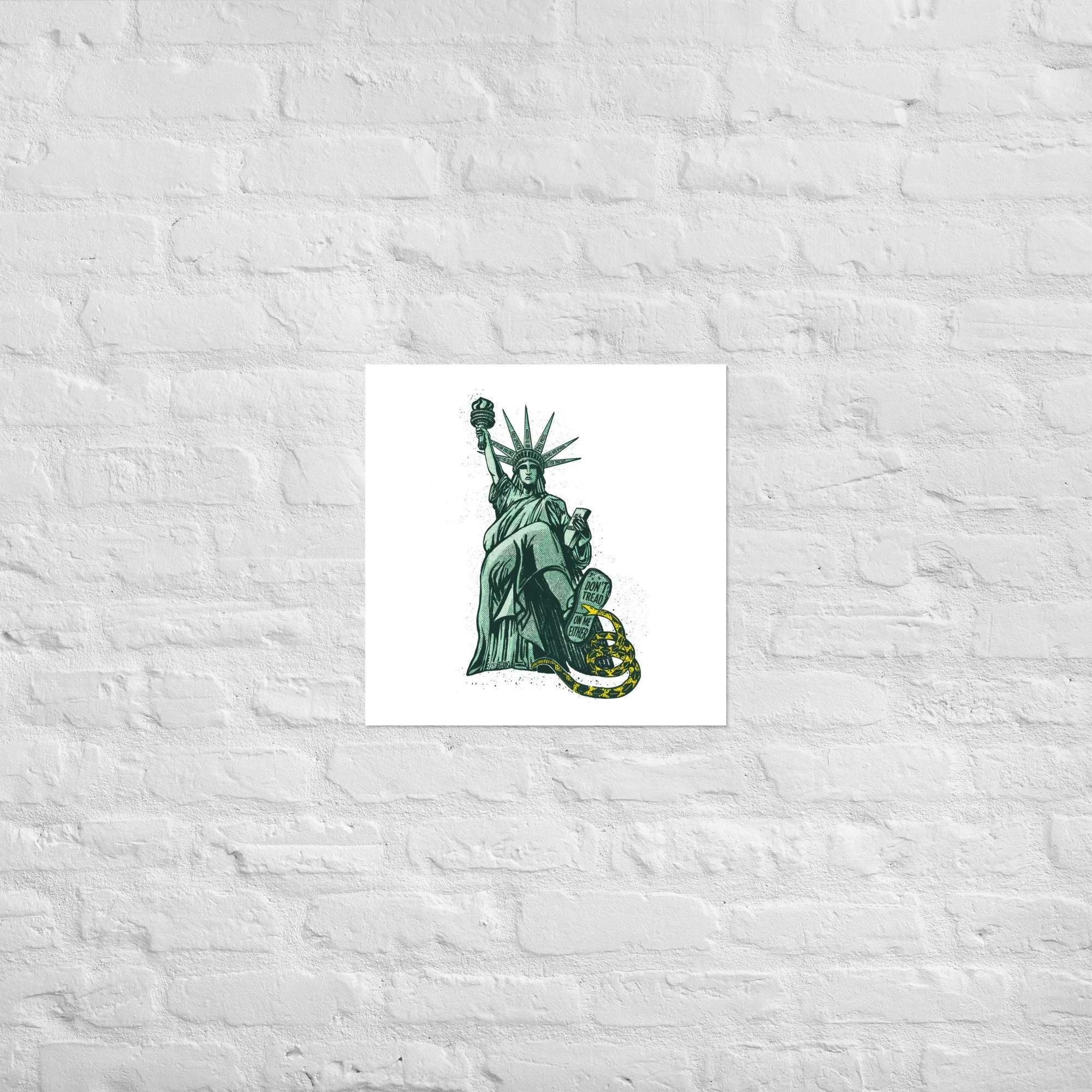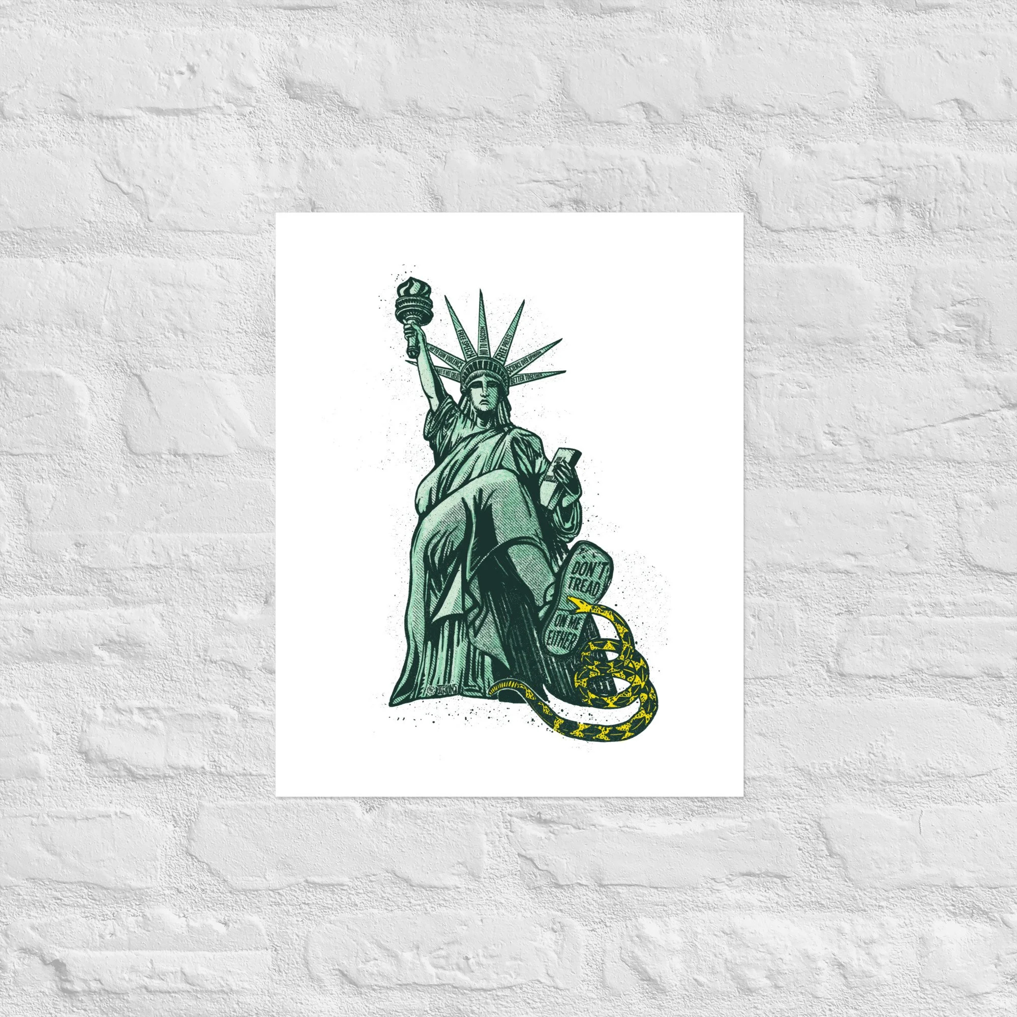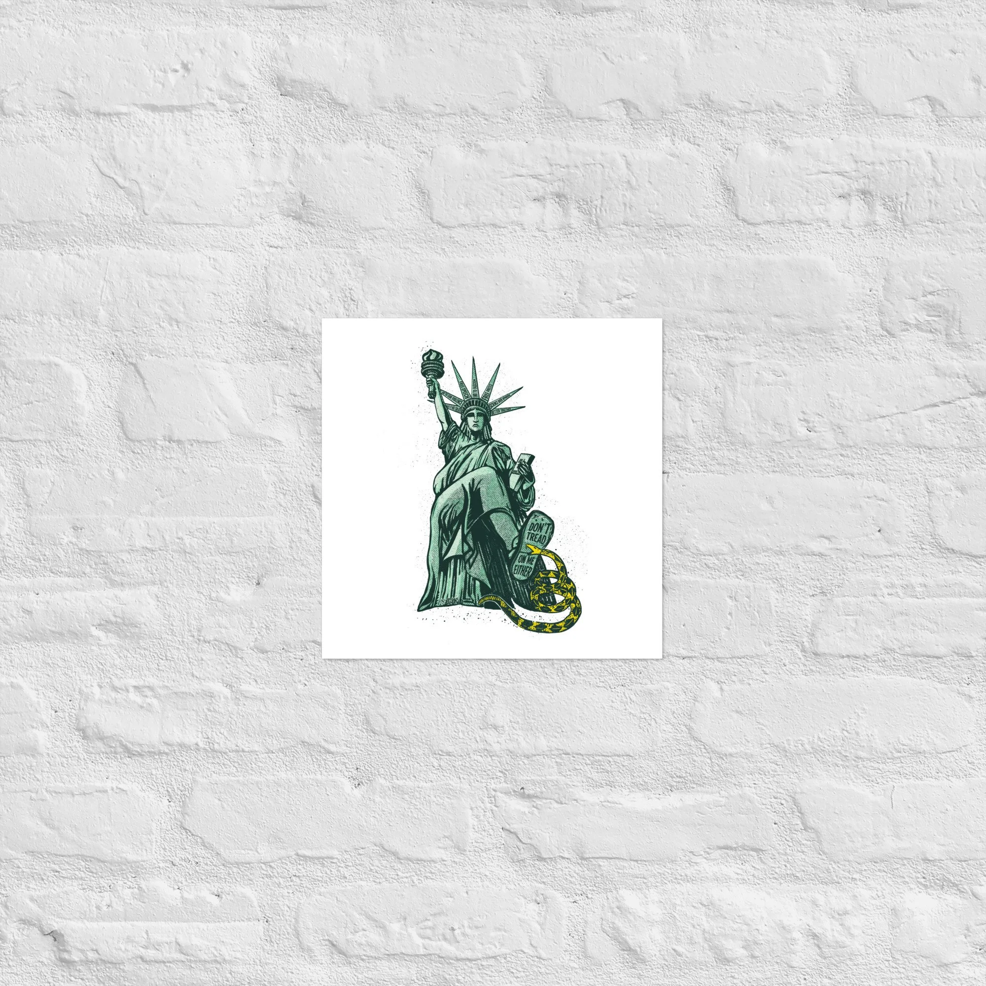 This piece flips the old “Don’t Tread on Me” symbol on its head — literally. The Statue of Liberty rises up and stomps on the Gadsden snake, reclaiming the phrase for those who believe in freedom, equality, and justice for all.